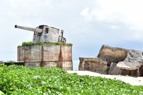 ニッポン・コーズウェイを渡りベッソ島に入ると、すぐ左側に空き地があります。ここには、大日本帝国軍が配備した高射砲があります。当時の日本軍は、敵襲が南側からくると想定し、これらの武器をベッソ島の東端から西端にかけて配置しました。しかし、アメリカ海兵隊は西岸~北岸(グリーンビーチ~レッドビーチ)から上陸しています。このため東端にあったこれらは攻撃を受けず、当時のそのままに放置されているようです。