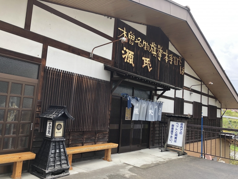 【旗挙そば 源氏】も、第37宿場の「宮ノ越宿」にあります。現住所でいえば 木曽町。国道19号線沿いにあり、「七笑」や「中乗さん」といった地酒の幟が目立つ大きな建物なので、すぐに気付くはず。