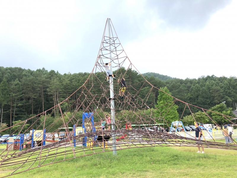 【こだまの森】の駐車場からまず目に入るのは、ロープで作られたとても大きな遊具。小さい子は下の方で遊び、大きな子は上の方まで登って楽しんでいます。もし落ちてもロープが守ってくれるような造りになっていますが、なるべく子供から目を話さないようにしましょう。