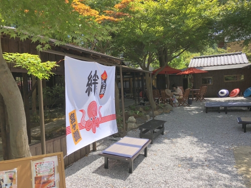 2018年にオープンした「絆」は、朴葉焼きメインの定食、たこ焼き屋、和カフェが一緒になっています。森林の木立の中にある和風庭園の、落ち着いた雰囲気の中で食事をいただけますよ。
