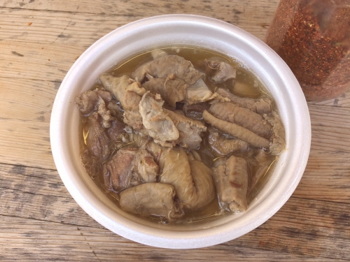 厚木に本店があり、この周辺ではよく知られている肉屋さん。中でもモツ煮は、モツ好きの人にぜひおすすめしたい一品です。他の店では野菜が入っていることが多いモツ煮ですが、これには野菜がなく、たっぷりモツを味わうことができます。でも味は濃すぎず、そのまま飲める味のスープなのです。
