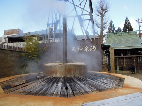 天神泉源は、商店街から細い道を少し入ったところにある、金泉の泉源です。学問の神様「天神社」の境内にあります。