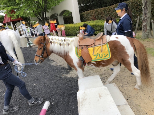 幼児はポニー(写真左)、背丈が低いので小さなお子様も乗りやすく、ポニーの毛も可愛く編み込みが。一方、小学生以降は立派な馬(写真右)に乗ることができます。