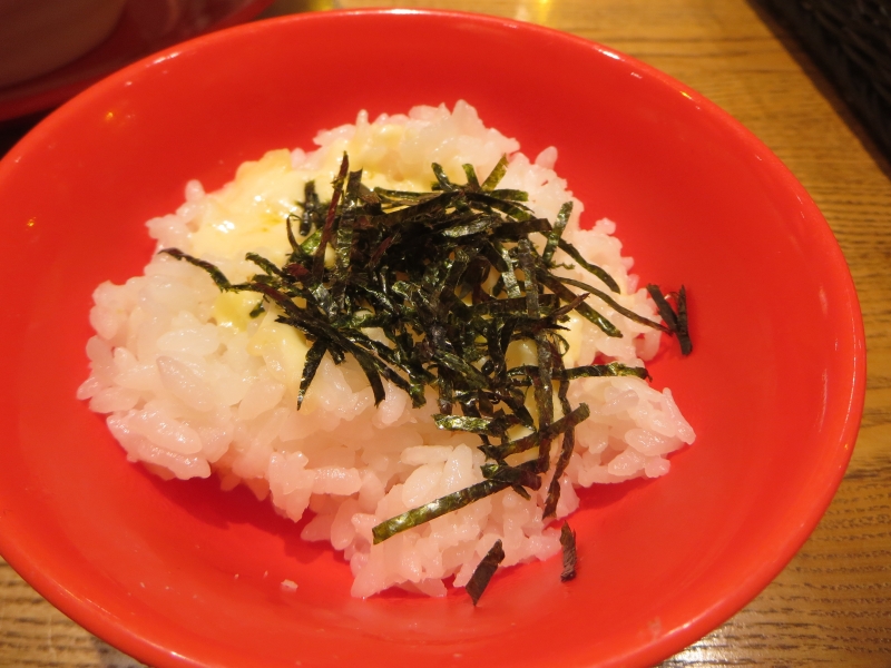 麺を食べ終えると、お店オススメの食べ方を試してみましょう!チーズかえめし(180円)を注文して、チーズと海苔がトッピングされたご飯を残ったスープに入れます。