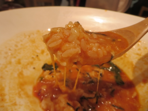 即席のチーズリゾットの出来上がり!スープの熱でチーズがトロケて、まろやかになって一層舌触りも良くなる感じ。