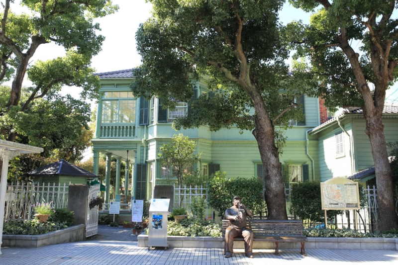 風見鶏の館の隣にある「萌黄(もげい)の館」は、その名の通り優しい萌黄色の外壁に包まれた、かわいらしい洋館です。この建物は、明治36年にアメリカ総領事の邸宅として建築されており、国指定重要文化財に指定されています。
