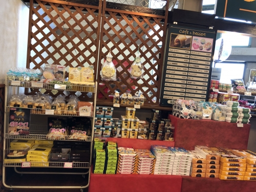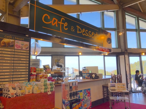 ドリンクやデザートは、奥のカフェカウンターで渡されます。また、カウンター前にはお土産やウィンタースポーツに必須のアイテムも売っていますヨ。