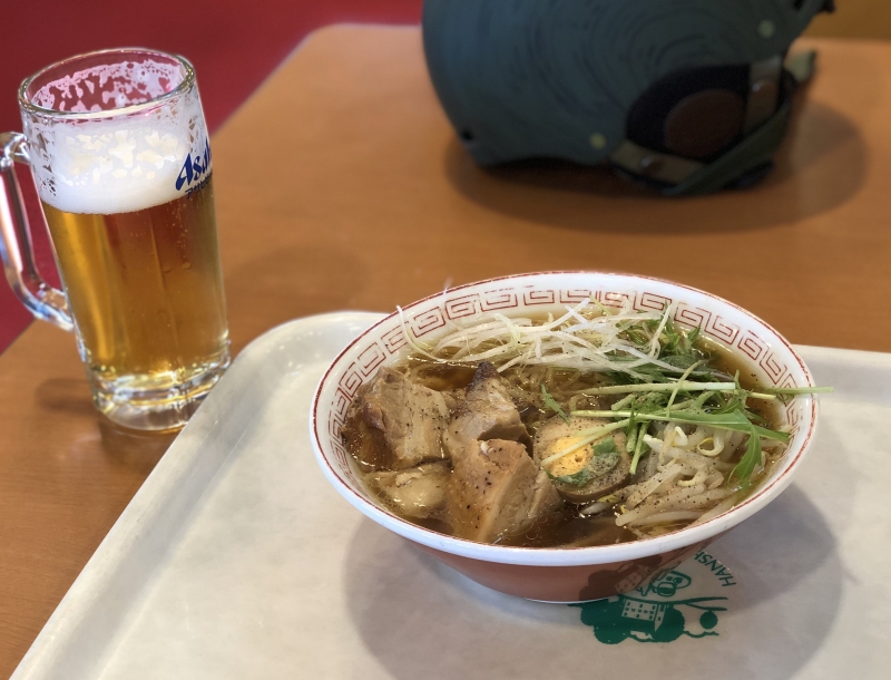 【手作り角煮ラーメン 900円】醤油ベースのスープに角煮がとても柔らかくて、ボリューム満点! 生ビールは580円です。