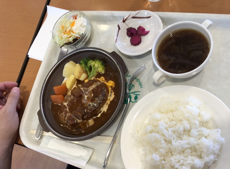 【煮込みビーフハンバーグセット 1,100円】ビーフ100%のただのハンバーグではなく、“煮込み” という工夫があって良いです。