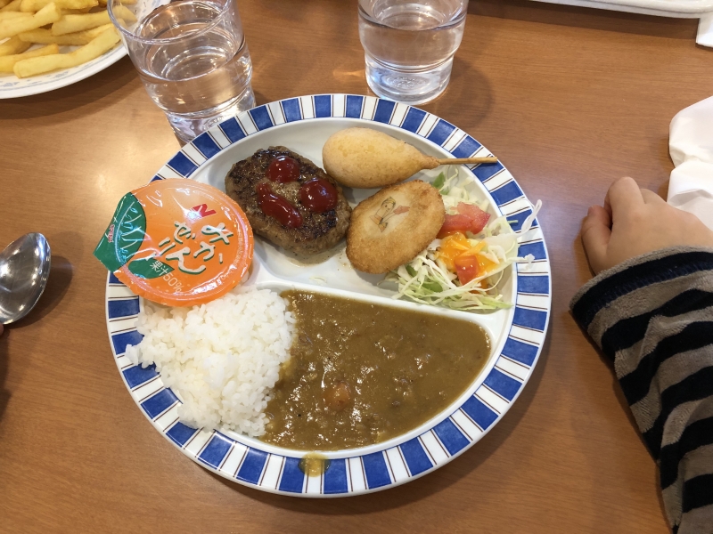 【「スノイル」のキッズプレート 800円】カレー、ハンバーグ、アメリカンドッグ、コロッケ、サラダ、みかんゼリーと盛り盛り。お子様用のメニューにもう1つ【お子様甘口ビーフカレー 750円】もあります。