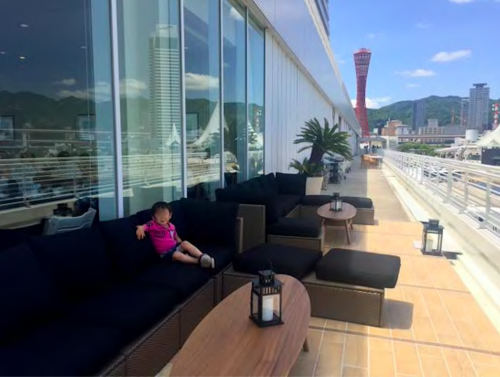 また、テラス席を左、左へ…と進むと、お食事はできませんが、まったりと神戸港が見渡せるソファもあります。ここからはメリケンパークが見渡せます。お腹がいっぱいになったら、このソファでひと休憩もいいかもしれませんが、眠ってしまわないようにご注意を…(笑)。
