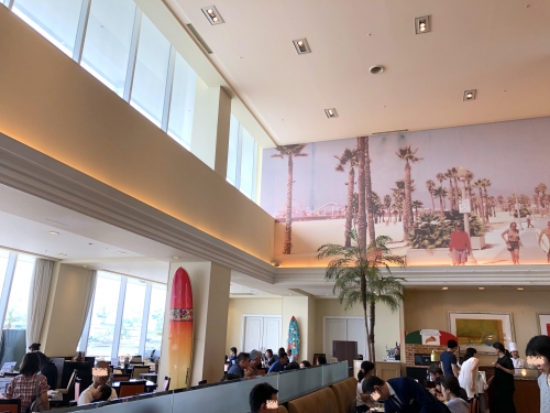 天井が高くて壁にはサンタモニカの海岸の写真、柱に設えてあるサーフボードも1つ1つがかっこいいです。