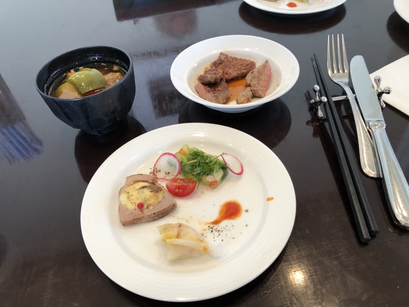 ご参考までに、上記の写真は、マンスリーメニューから 夏野菜 和のカレー鍋 (お椀)、季節野菜のゼリー寄せと豚肉のコンフィ ベアルネーズクラッセ(白い平皿)、そしてライヴキッチンから ステーキ(白い小皿)です。
