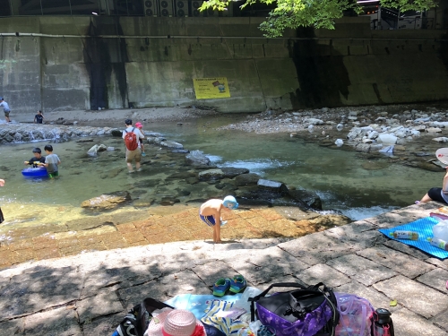 この【新神戸駅の真下】が人気なのは、ただ水がキレイなだけではなく、気持ちいい木陰 。川や海へ遊びに行くと、だいたいのところは日陰がなく、高い料金でパラソルを借りたりテントを持っていかないと熱中症の恐れもありますが、ここは木陰がとても気持ちが良い〜んです。