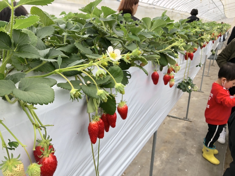 ビニールハウスの中は、いちご狩りの観光客には嬉しい 高設栽培 。いちごに土が付かないので洗わなくて良いですし、大人は採る時に屈んで腰を痛めることがありません。6歳くらいの小さなお子様の目線の高さなので、お子様から大人まで採りやすいのです。