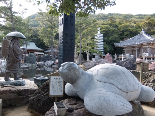 竜宮城より赤亀が梵鐘を背負って寺へ奉納した、という伝説がある寺院。その梵鐘には「延喜十一年正月」(911年)と刻まれており国の重要文化財に指定されています。また、本堂横には弘法大師が杖で突いて湧き出させたとされる「目洗い井戸」があり、眼病に効くと言われています。