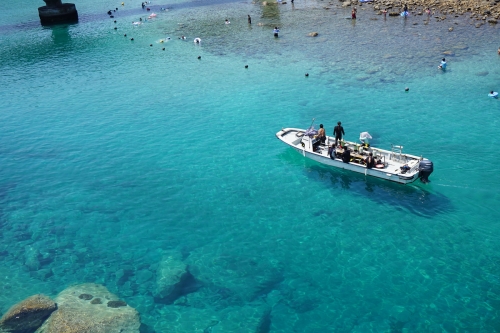 入江では大規模な鯛の養殖が行われており、島へ向かう道中でその光景を見下ろすことができます。ダイビングやシュノーケリングなどのマリンスポーツを楽しみに訪れる人のほか、釣りを目的として訪れる人も多い人気の島です。