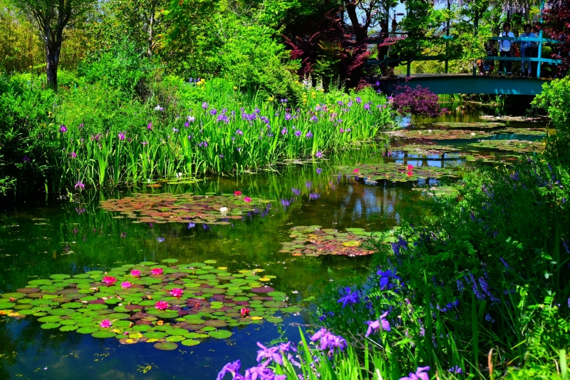 モネの絵画の中でも代表作となった「睡蓮」の庭が、美しく再現されています。池の周りには沢山の木が植えられており、藤の花の太鼓橋、薔薇のアーチなど見どころが沢山あります。