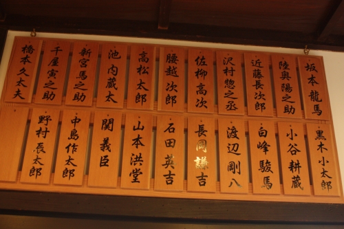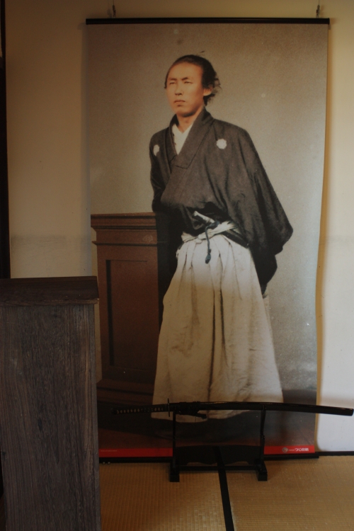 中は一部を除いて撮影可能です。有名な坂本龍馬の写真と同じように、台座にもたれて記念撮影することもできます。室内は10畳、8畳、3畳、プラス縁側という決して広くはない間取り。この場所で膝を付き合わせ、語り合っていた社中のメンバーの熱が伝わってきます。