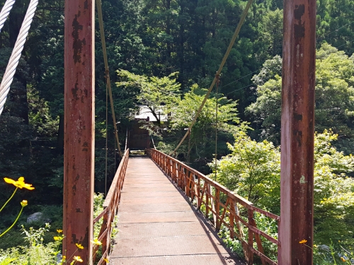 早明浦ダムから、アメガエリの滝を目指していると、突然現れる赤い吊り橋と、大きな夫婦杉。ここまで来る山道は細く、携帯電話の電波が届かない所も。小さな集落がいくつかありますが、人影は無く、出くわしたのは対向車数台のみ。延々と早明浦ダムから支流の瀬戸川沿いを山奥へと車を走らせて、ようやくたどり着きます。
