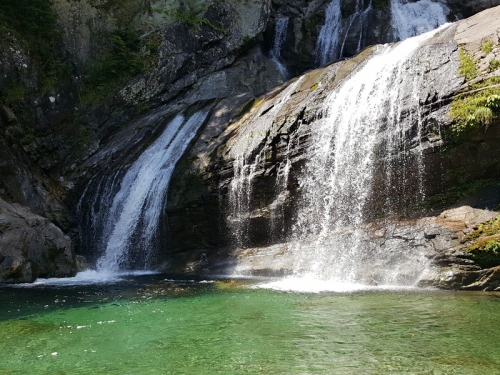 アメガエリの滝は、吉野川支流の瀬戸川渓谷にあります。山道を進んで行くと、小さな看板が現れ、直ぐ脇にある小道を河へ下ると滝が見えてきます。大きな岩が2枚重なったような、横長の滝は、ゴウゴウと大きな音をたて、美しいエメラルドグリーンの滝壺へ。水は冷たく、澄んでいてとても美しいです。