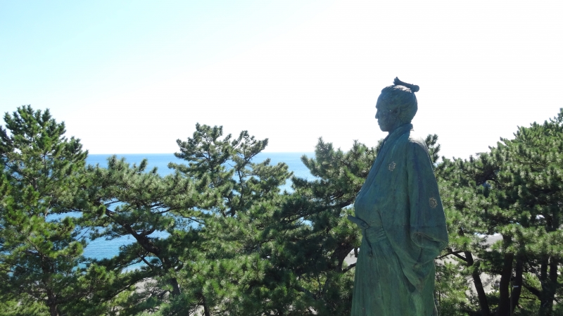 桂浜には、高知出身で幕末の英雄・坂本龍馬の銅像があります。建てられたのは、昭和3年(1928年)。高さは約5.3メートル、台座を含めると約13.5メートルとなっており、アメリカの方角を向いています。