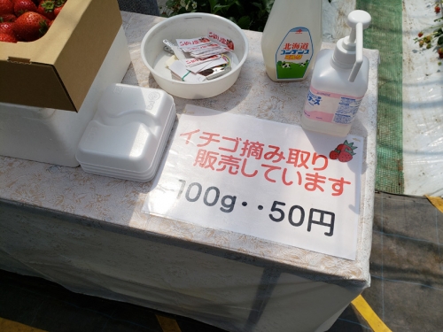 イチゴ狩りをされる方限定ですが、ハウス内のイチゴを100g/50円という格安価格で購入する事ができます。上記写真A4サイズほどの箱で450円、小さいパックで140円ほどでした。お土産にぴったりです。
