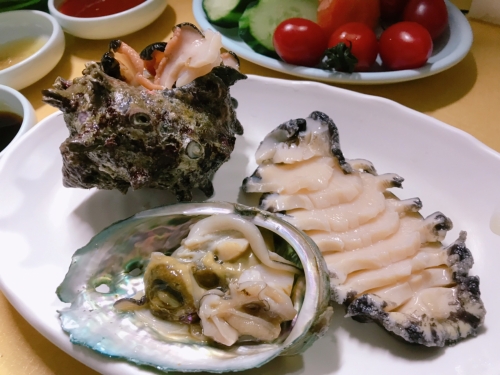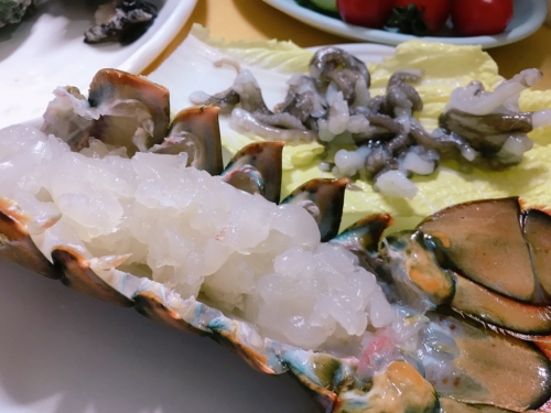 コースのはじめは刺身です。アワビ、たこ、サザエ、ロブスターの尻尾部分をいただくことできます。