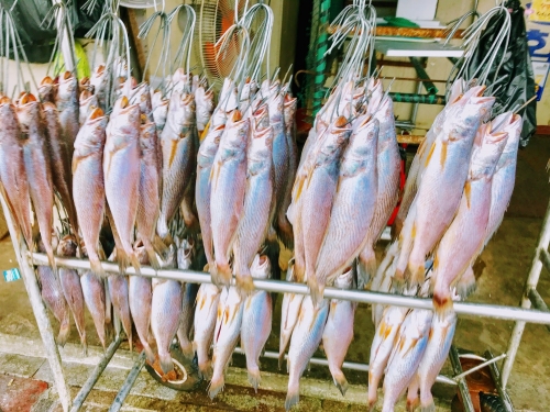 まずは干物。イワシやアゴなどの煮干しや、ジャコなども販売されていました。こんな間近で魚が吊り干しされている光景をみることは中々ありませんので、とても新鮮な気持ちになります。