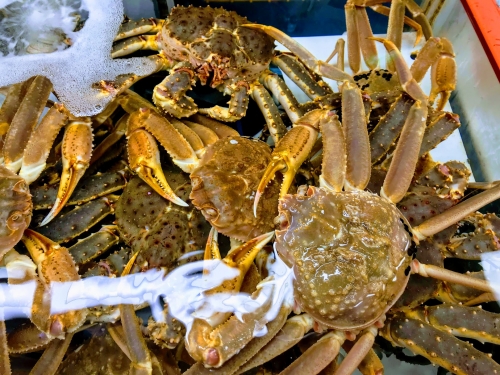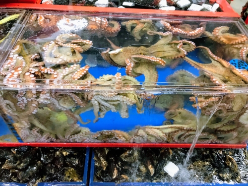 先ほど紹介したカニですが、中の市場にも大量にいます。釜山ではタコもよくとれるので、タコを並べている店も多いです。こんな大量の魚を見ていると、海にはどれだけの魚がいるんだろう…と思ってしまいました(笑)