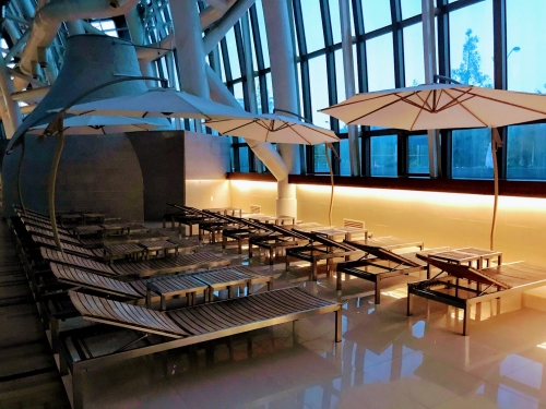 写真左の、洞窟みたいな建物がチムジルバンです。ここでたっぷり汗をかき、日ごろの疲れを癒しましょう!また、チムジルバンの近くには、写真右のように寝転がってゆっくりできるチェアーもありますよ。