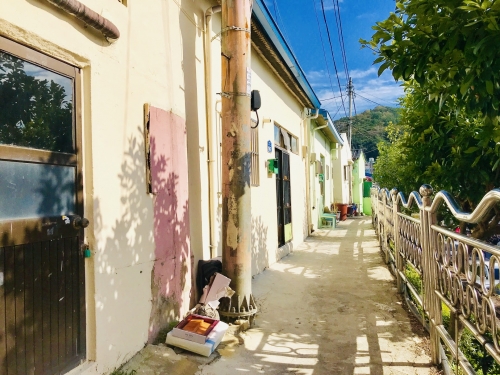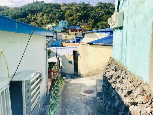 この綺麗に並んでいる集団住宅は、韓国では甘川でしか見られない特徴的な住宅形式となっています。裏の家が隠れないように建てられた美しさや、朝鮮戦争時代の名残である地形を生かした狭い山腹道路は、文化的にも保存価値が高いといわれています。