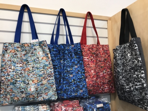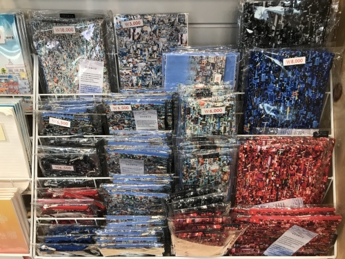 甘川文化村の光景がモザイク状に描かれたトートバックやポーチ、ペンケースです。特に右のポーチやペンケース類は600円から購入することができますよ。とてもユニークなお土産です!