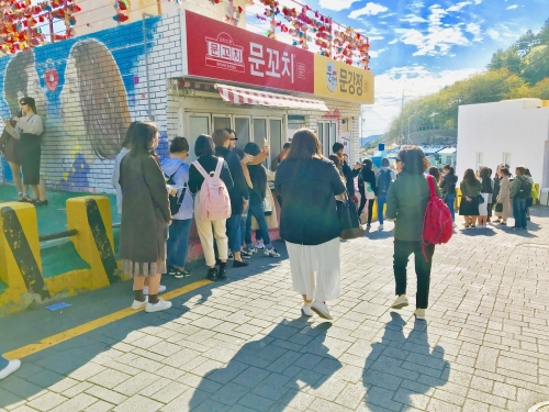 筆者が甘川文化村を訪れた際、一番の行列を見せていたのがこのスポットでした。それでも、10分も待てば写真を撮ることができますよ!場所は、スタンプ地図の「63番 星の王子さまとキツネ」です。