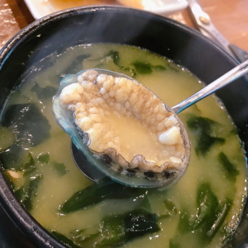 この「プンウォンジャン」でも、韓国らしい贅沢なわかめスープをいただくことができます。牛肉、アワビ、カレイ、貝の4種類から具を選び、わかめスープに入れてもらいます。どれも素材の出汁がきいていて、コクもあり絶品です。今回筆者が注文したのは「アワビ入りのわかめスープ 17,000ウォン(1,515円)」です。しっかりとした大きさのアワビが2つも入っていて贅沢そのもの!!