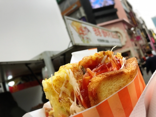韓国トーストは、バターの香りがきいていて、野菜が入った卵焼きが挟まれています。注文をとってから、屋台のおばちゃんが手際良く、調理してくれます。普通に作っているだけなのに、パフォーマンス力が半端ありません。甘めの卵焼きにケチャップがかかっていて、癖になる味です。