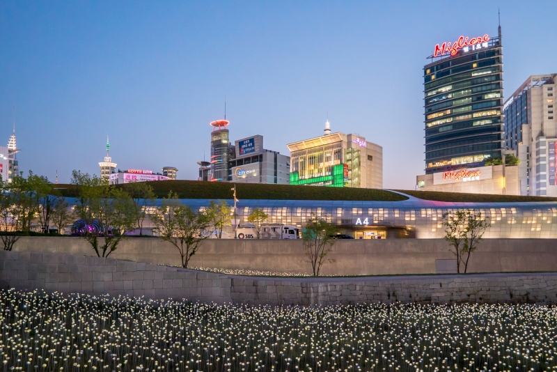 イラク出身の建築家ザハ・ハディッド氏が設計した、東大門の新ランドマーク。流れるような曲線が特徴の近未来的な建物は、大型イベントを開催する「アートホール」、デザインに関連する展示を行う「ミュージアム」、ライブラリー・ギャラリー・ショップが集結する「デザインラボ」、そしてカフェやショップが集まる地下街「デザインマーケット」の4つから構成されています。