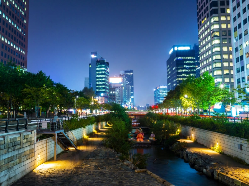 光化門から東大門のあたりまで、ソウルの中心部を流れる約5.8kmの人工河川。ソウル市民の憩いの場となっており、明洞からも徒歩圏内です。昼間の散歩も気持ちがいいですが、夜はライトアップされソウルの定番のデートスポットとして人気。