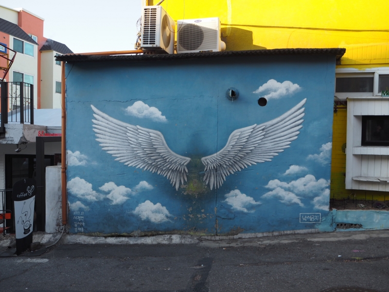 13位にランクインした「梨花洞壁画村」にある羽の壁画。梨花洞壁画村にあるフォトスポットの中でも人気ナンバーワンを誇ります。韓国の人気バラエティー番組『1泊2日』内で人気俳優さんが写真撮影をしたこともあり、その知名度は一気に上がりました。撮影をするために列ができることも日常茶飯事です。