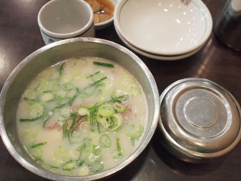 辛さ際立つ韓国料理のなかで、癒し的存在のソルロンタン。牛の肉や骨を長い時間煮込んだミルク色のスープで、参鶏湯と並んで滋養強壮に効き目がある料理として知られています。