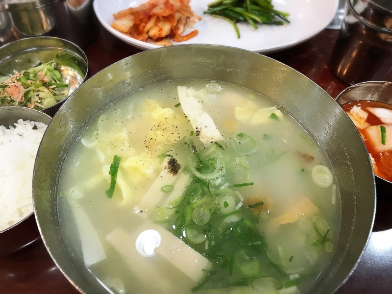 プゴクスープとは、干しだらを使用したスープのことで、こちらのお店では干しだらの他、豆腐や卵、ネギが入っています。シンプルな料理ですが、旨味はしっかり。韓国では二日酔いや美肌効果があると言われていて、とくに朝はお店がとても混雑しています。
