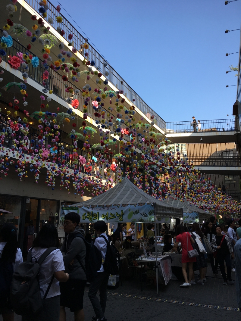 「梨花女子大学校」があるため、女子大生をターゲットにした可愛くてプチプラなファッション&雑貨店が集まるエリア。特に「梨大ファッション文化通り」では、10代から20代前半の女性が好む安くておしゃれな洋服が手に入ります。梨大駅周辺にはローカルグルメの屋台やジューススタンドがあるので、小腹を満たしながらショッピングを楽しみましょう。