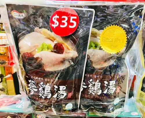 左のものは、アワビが入った参鶏湯で2袋入り46ドル(≒5,000円)、右のものはフカヒレが入った参鶏湯で2袋入り35ドル(≒4,000円)です。
