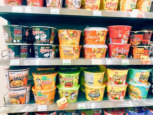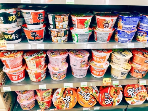お菓子やドリンクほどではないですが、韓国のコンビニにはカップラーメンが大量に売っていて、まさにカップラーメン天国です。どんなに小さいコンビニでも、カップラーメンのコーナーは比較的大きくとられています。味付けは基本辛め。一般的なスープ麺もありますし、焼きそば風もあります。