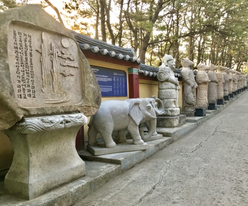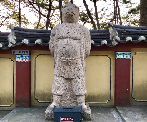 参道には大きな十二支神像があります。この十二支神像は一体を除いて日本の干支(えと)と同じ!!日本の干支ではイノシシのところ、韓国の干支では豚だそうです。こういった違いを間近で感じられるのもいいですよね?