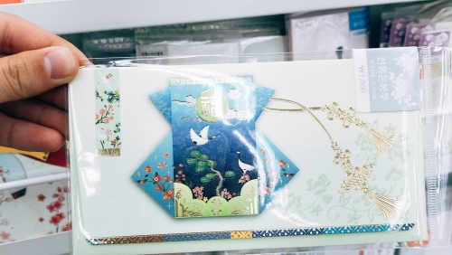 韓国の伝統封筒です。ポントゥ(봉투)とよばれ、お金などを手渡すときに、このような封筒が使用されるそうです。チマチョゴリや鶴のデザインがいかにも韓国風で素敵ですね。