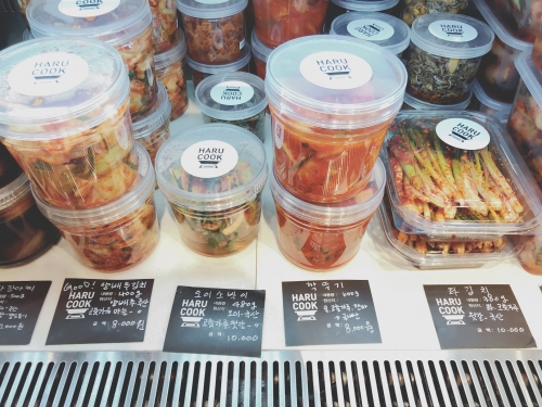 こちらは、ロッテデパート地下1階フロア内の「HARU COOK(ハル・クック)」という韓国料理の惣菜屋さんで買える、本場のキムチとナムルです!写真のものは、10,000w(≒1,000円)から購入できます。