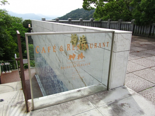 奥社の西側には断崖があり、その上方には天狗と烏天狗の彫物が展示されています。かなり上の方なので、目を凝らしてよ〜く見てくださいね!奥社からの眺望は素晴らしく、琴平の町から讃岐富士、さらに遠くの瀬戸内海まで一望することが出来ます。
