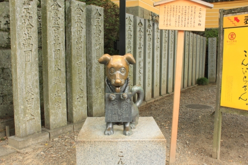 金刀比羅宮の境内にある犬の銅像。江戸時代、庶民の旅行は禁止されていましたが、神仏への参拝はその限りではありませんでした。数ある神社仏閣の中でも伊勢神宮と並び、庶民にとって一生に一度の夢とまで言われた憧れの地が、金刀比羅神社と京都の東西本願寺だったのです。とは言え、江戸を中心とした東日本から西にあるこれらの社寺へのお参りは容易ではなく、当人に代わって旅慣れた人が代理で参拝に行くこともありました。これを「代参」と言いました。そして実は、代参をしたのは人だけではなかったのです。「こんぴら参り」と記した袋を首にかけた犬が、飼い主の代参をすることもありました。 袋には飼い主を記した木札、初穂料、道中の食費などが入っていて、犬は旅人から旅人へと連れられ、街道筋の人々に世話をされ、目的地にたどり着いたと言います。このようなことから、「こんぴら参り」の代参をした犬は、特に「こんぴら狗」と呼ばれていたそうです
