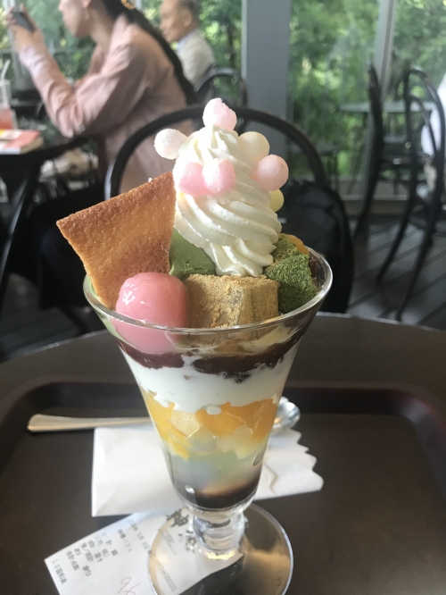 今回は、カフェの方で「神椿パフェ(900円)」を頂きました。抹茶アイスやわらび餅、あんこや白玉などの和の食材がふんだんに使われている、ボリュームたっぷりの絶品パフェです。パフェの上に乗っている白やピンクの丸いものは、「おいり」と呼ばれる讃岐のお菓子で、あられのような食材です。見た目もとっても可愛らしいですよね☆